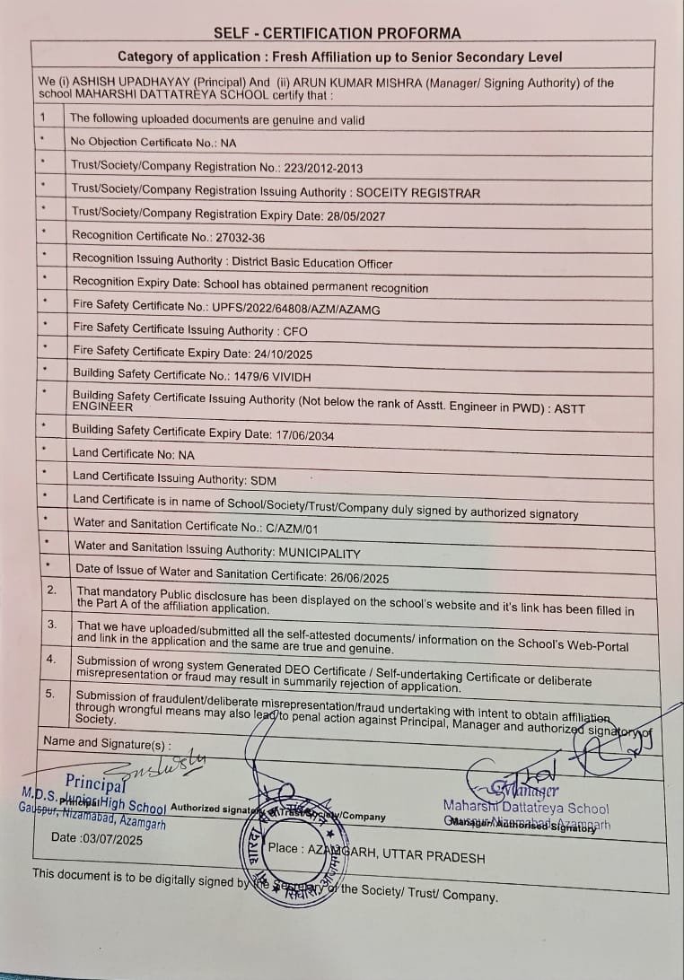 | 7 | COPIES OF THE DEO CERTIFICATE SUBMITED BY THE SCHOOL AFFLIATION/UPGRADATION/EXTENSION OF AFFLIATION OR SELF CERTIFICATION BY SCHOOL | Click For Show |